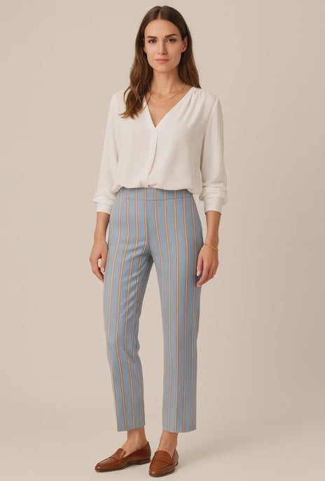 Gönnen Sie sich die perfekte Mischung aus Stil und Komfort! Die Seductive Nanette Streifenhose in melange Blau-Beige-Weiß zaubert eine elegante Silhouette dank ihres figurschmeichelnden Materials und High-Rise-Schnitts. Mit ihrem klassischen, geraden Schnitt und dem trendigen Streifenmuster wird jedes Outfit sofort zum Hingucker – für selbstbewusste Frauen, die Mode lieben!