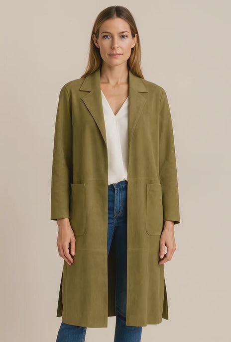 Dieser elegante Veloursleder-Mantel in zartem Pistazie-Grün ist ein echtes Highlight für Ihren Frühlings- und Sommerlook! Das weiche, hochwertige Leder fällt herrlich leicht, der offene Schnitt streckt die Silhouette und verleiht jedem Outfit sofort eine luxuriöse, moderne Note. Ein Statement-Piece für Frauen, die Stilgefühl und Selbstbewusstsein ausstrahlen möchten.
