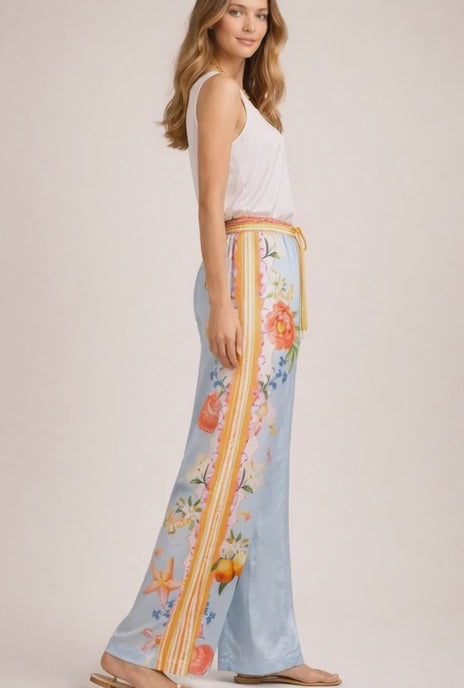 Leichtigkeit trifft Stil! Diese helle, multicolor Hose von Hale Bob bringt frischen Sommerflair in Ihren Kleiderschrank. Mit ihrem weiten Bein, dem hohen Sitz und dem verspielten Muster aus Blumen, Muscheln und Schmetterlingen fühlen Sie sich rundum wohl – perfekt für entspannte, aber stylische Auftritte.