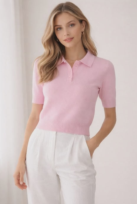 Kombiniere den kurzen Polo-Pullover mit einer weißen Leinenhose und flachen Loafers für einen frischen Sommerlook, oder zu einem Midirock und Sandalen für feminine Leichtigkeit. Für ein legeres Outfit passt er perfekt zu Jeans und Sneakern – ein vielseitiger Begleiter, der deinen Frühling/Sommer-Look auf ein neues Level hebt.