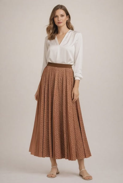 Schwingen Sie stilvoll durch den Sommer! Dieser lange Plissee-Rock von Herno in warmem Braun mit elegantem Kettenmuster vereint Leichtigkeit und Eleganz. Dank des soften Materials und des bequemen Gummibunds genießen Sie ein angenehmes Tragegefühl bei jedem Schritt – für pure Freude beim Tragen!