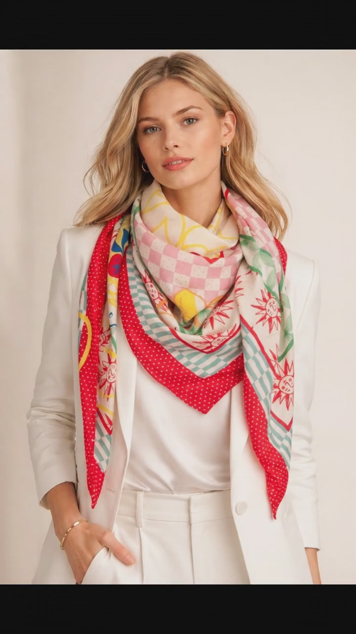 Das Design besticht durch einen eklektischen Mix aus Farben und Mustern: Ein klassischer roter Rand mit weißen Polka Dots rahmt ein verspieltes Zentrum ein, das von strahlenden Sonnenmotiven mit lächelnden Gesichtern, zarten Pastell-Checks in Rosa und Türkis sowie abstrakten floralen Elementen belebt wird. Diese harmonische Komposition aus kräftigem Rot und sanften Multicolour-Akzenten macht das Tuch zu einem vielseitigen Begleiter, der jedem Look eine individuelle, künstlerische Note verleiht.